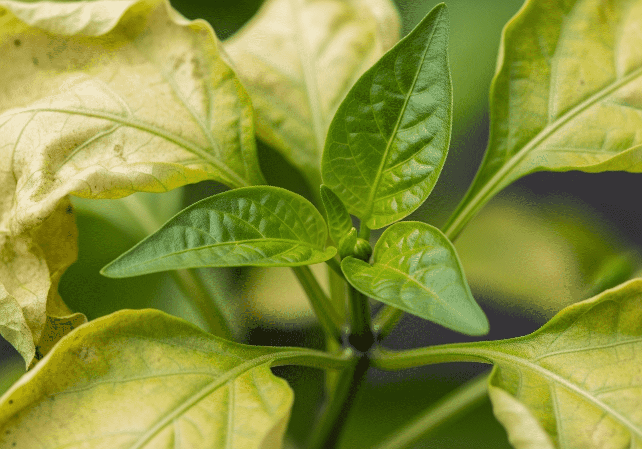 Gejala: Pucuk daun muda menguning, keriting, dan menggulung.